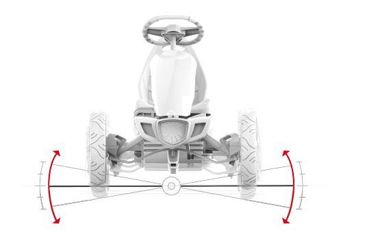 De voorste twee wielen van de skelter kunnen een op- en neergaande beweging maken. Dat is voornamelijk op oneffen gronden een groot voordeel. Door deze bewegingen blijft de skelter stabiel als er een heuveltje, steentje of zoiets dergelijks onder het ene wiel komt, het andere wiel past zich daar namelijk gewoon op aan. De op- en neergaande beweging kan worden gemaakt door de schommelas, de schommelas zorgt er dus voor dat je zonder zorgen rond kunt racen op elke ondergrond!